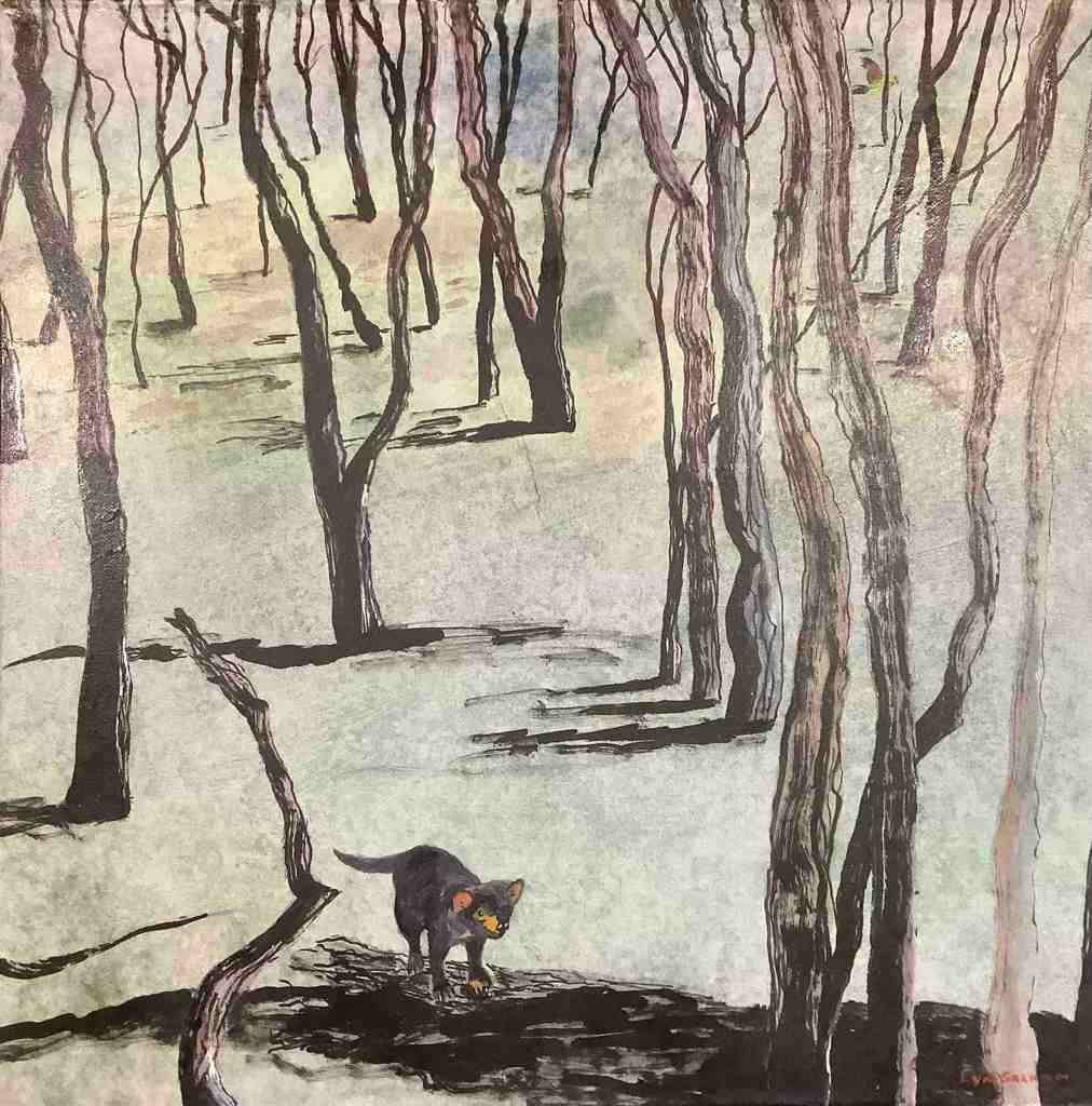 Lyn worked on Japanese rice paper with watercolour and black ink. She then sealed the paintings and mounted them on canvas with acrylic painting showing through to form the shadowy background.