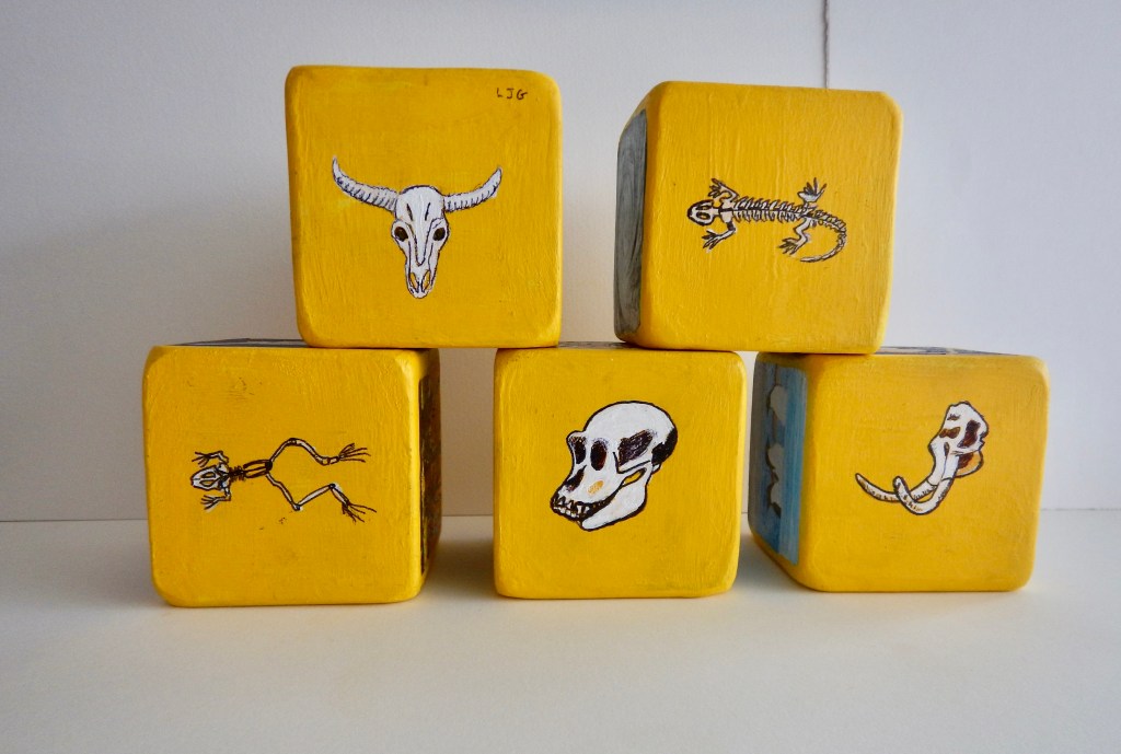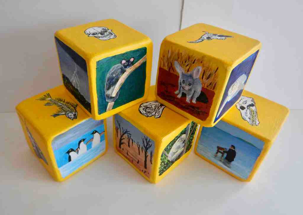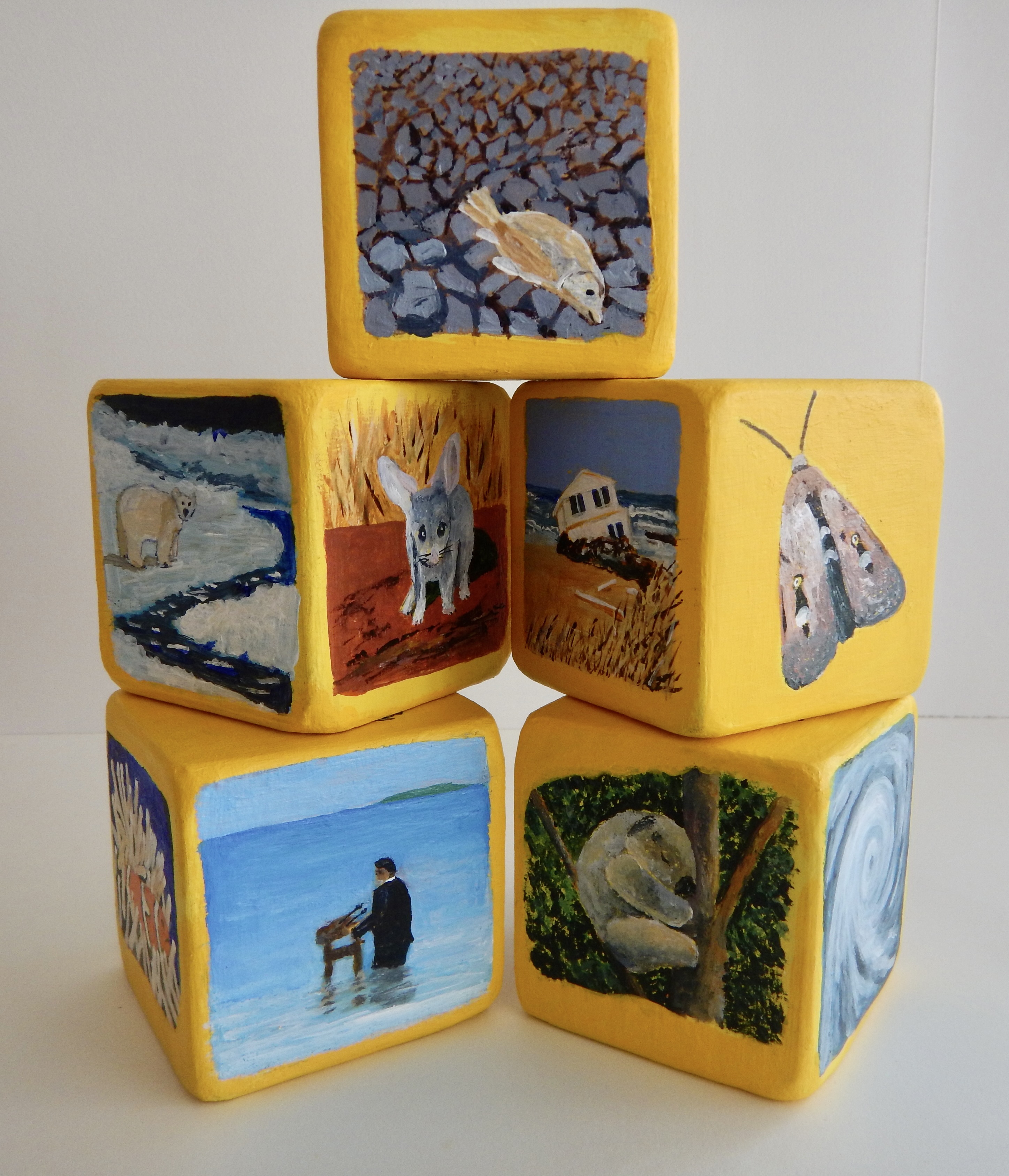 This artwork consists of 5 wooden blocks, each measuring 7 cm x 7 cm x 7 cm, with a different image related to climate change painted on each of the 30 surfaces.