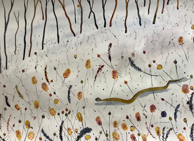 I make the marks in these paintings not only with brushes but with the leaves, seeds, lichens and sedges that I find along the way.