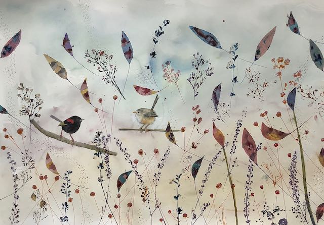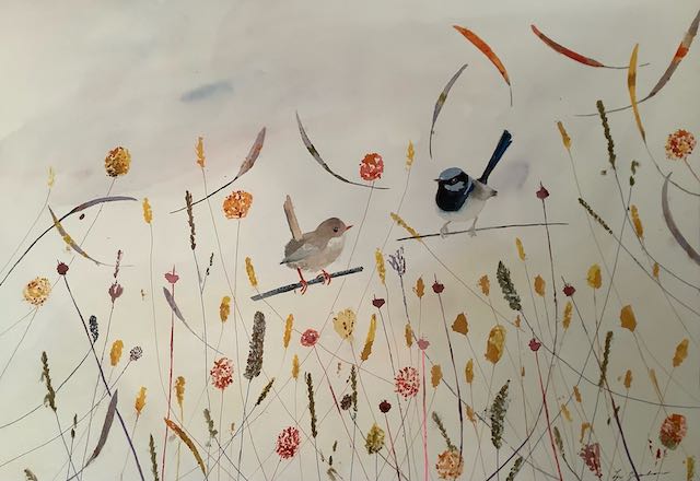 I still remember the first time I ever saw Blue-faced Honeyeaters. They didn’t look real with their olive green feathers and bright blue faces. Now, they’re often in our garden feasting on the grevillea outside the studio. They also hang upside down on the banana flowers.