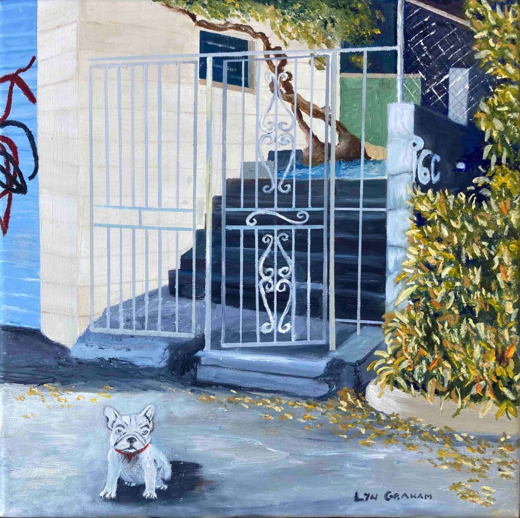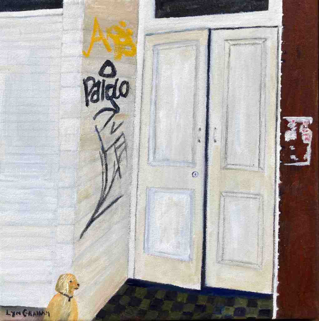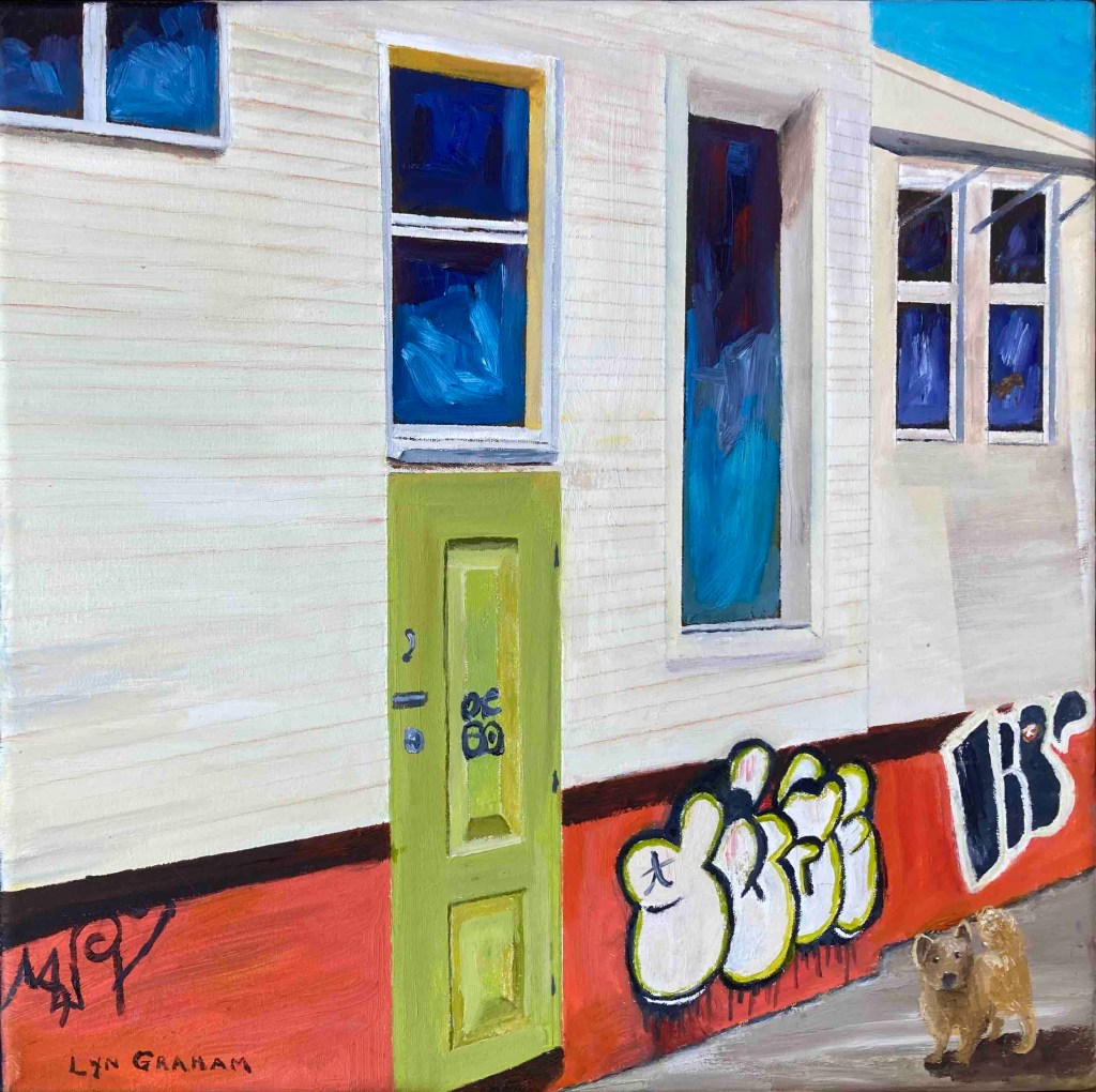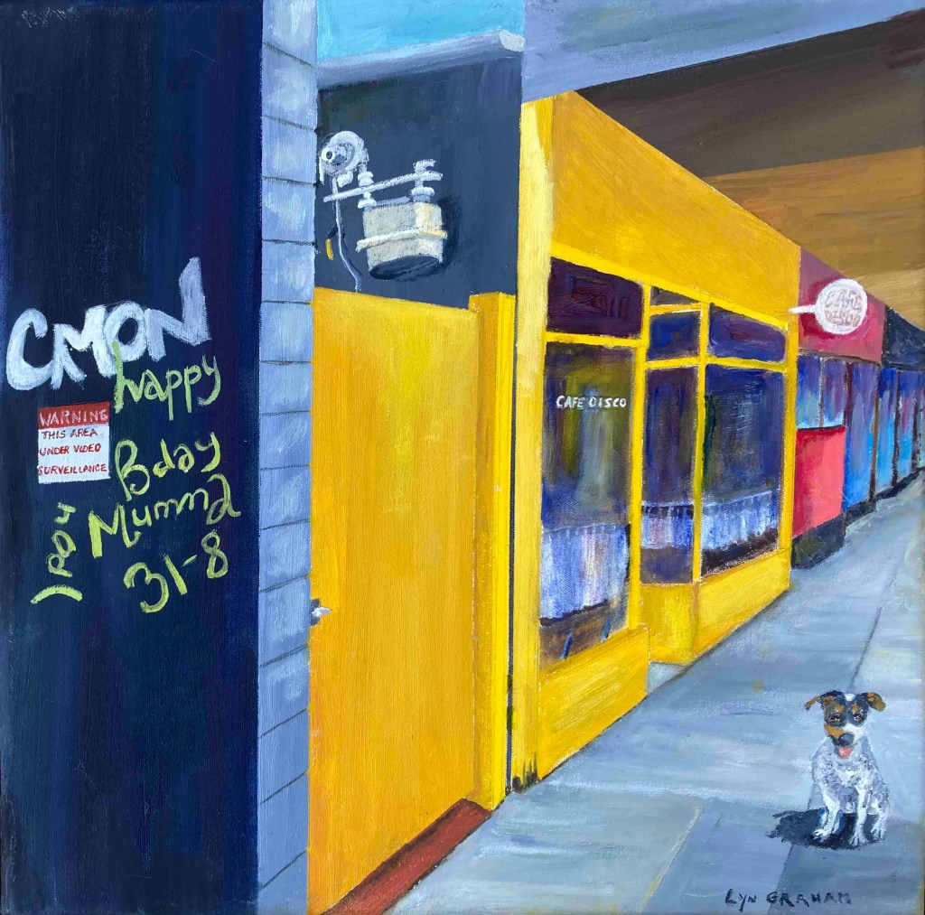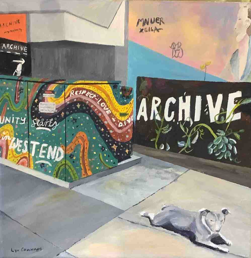 Lyn says, ‘My small Street Level paintings focus on West End’s gritty character – the doorways, alleys, graffiti and stairs we walk past every day. Over the 18 months of this project, I was struck by just how quickly our urban landscape changes as shops, cafes and bars come and go and graffiti is overpainted’.