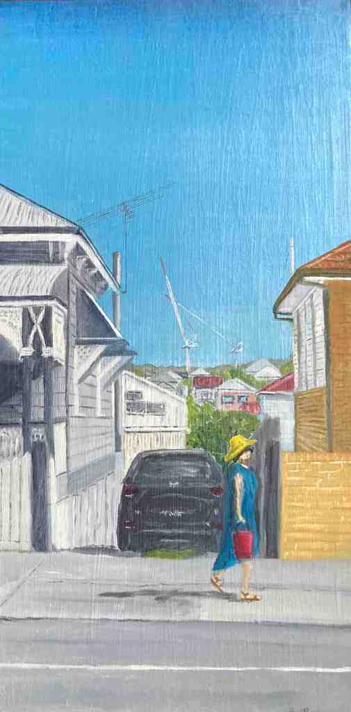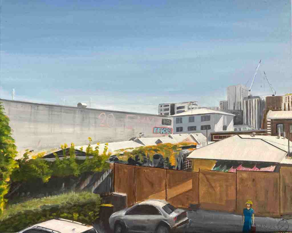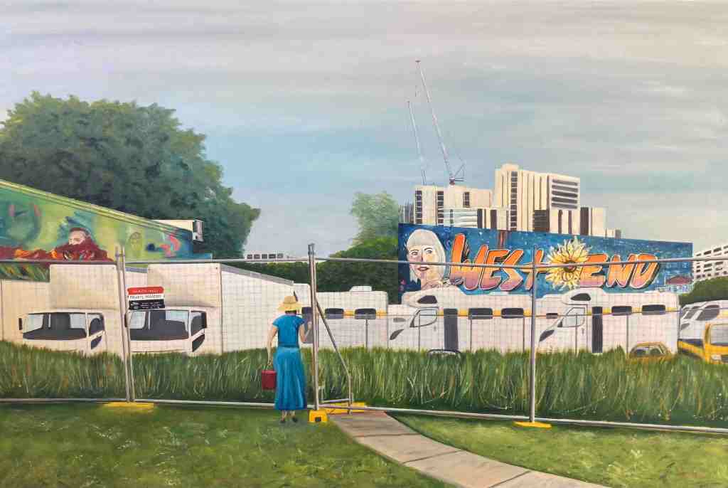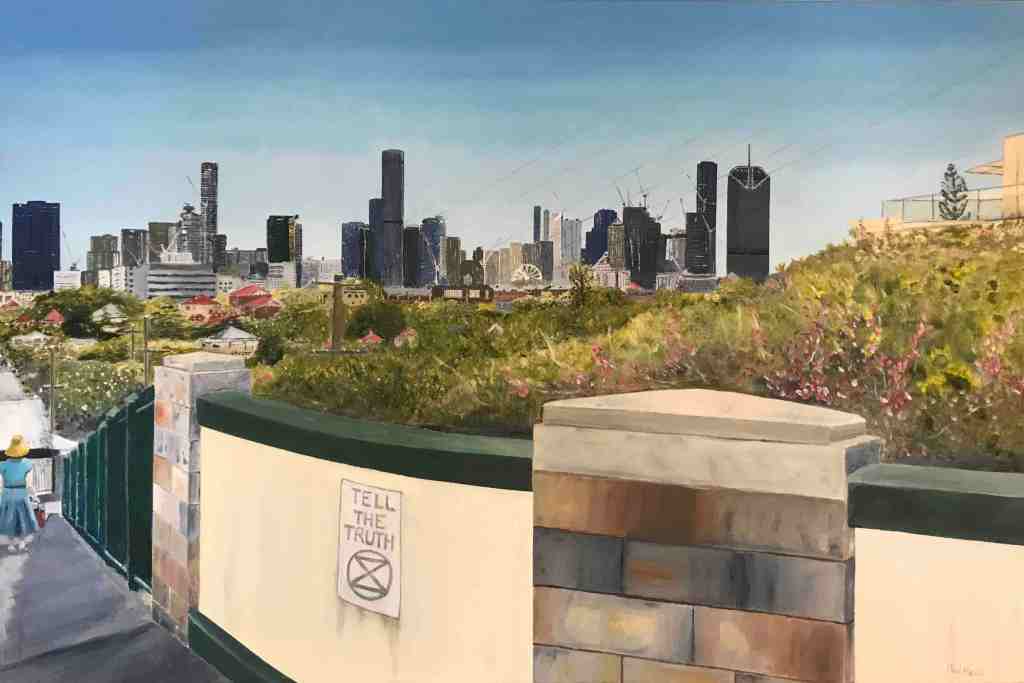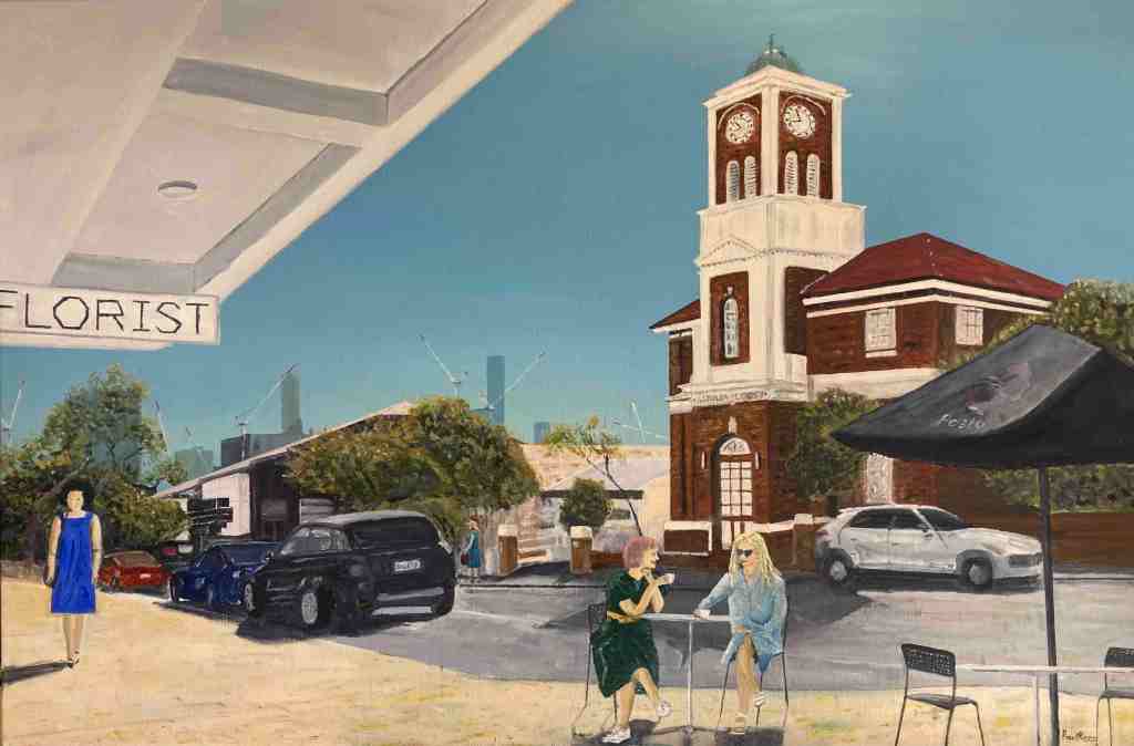 ‘My Towering paintings juxtapose old West End with the apartment towers and tower cranes that are transforming our suburb,’ says Paul. ‘I ponder what the future might bring. Each painting includes a woman with a bucket who the law would say has just committed, or is about to commit, a crime. But what is the crime and who has committed it?’