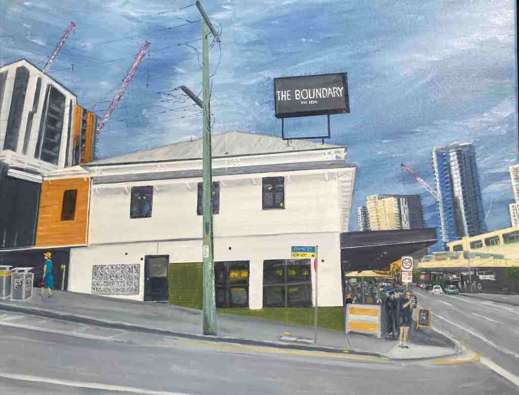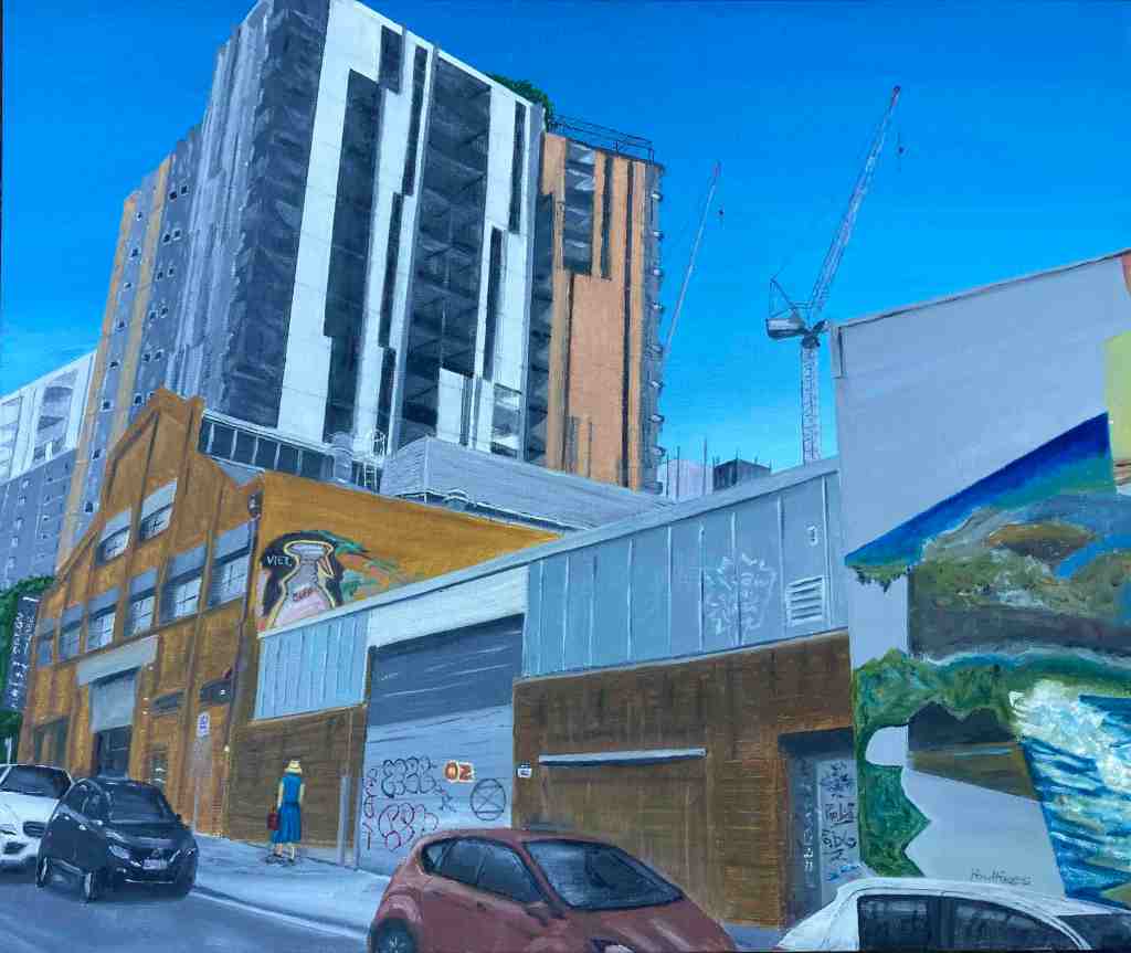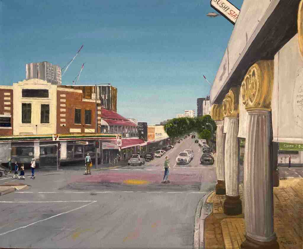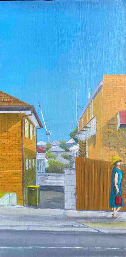 ‘My Towering paintings juxtapose old West End with the apartment towers and tower cranes that are transforming our suburb,’ says Paul. ‘I ponder what the future might bring. Each painting includes a woman with a bucket who the law would say has just committed, or is about to commit, a crime. But what is the crime and who has committed it?’